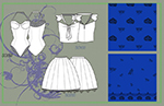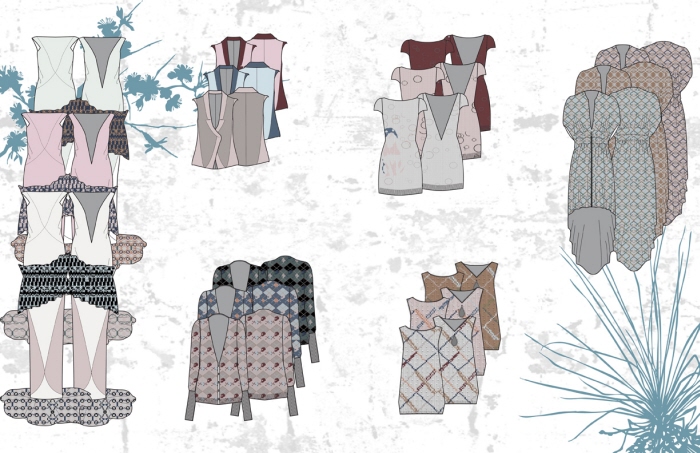 Design patterns and repeats from Lectra CAD program and Adobe Photoshop. The designs are mostly inspired by nature, geometrics and traditional patterns. The boards show a range of pattern repeat uses, such as brick, over all, plaids, and argyle.